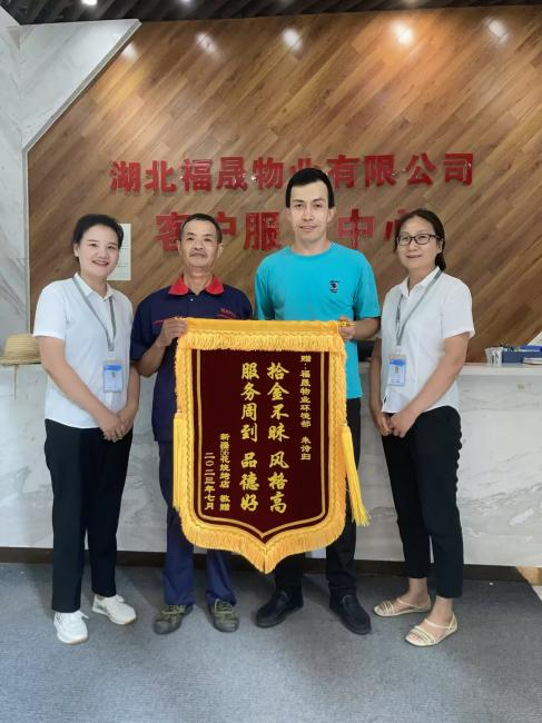 8月14日下午,百晟首府“新疆56花燒烤店“商戶老板帶著一面寫著“拾金不昧風(fēng)格高, 服務(wù)周到品德好”的錦旗來到福晟物業(yè)服務(wù)中心,專程表達(dá)了對綠化保潔員朱詩歸的感謝。